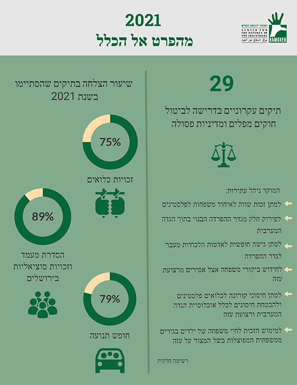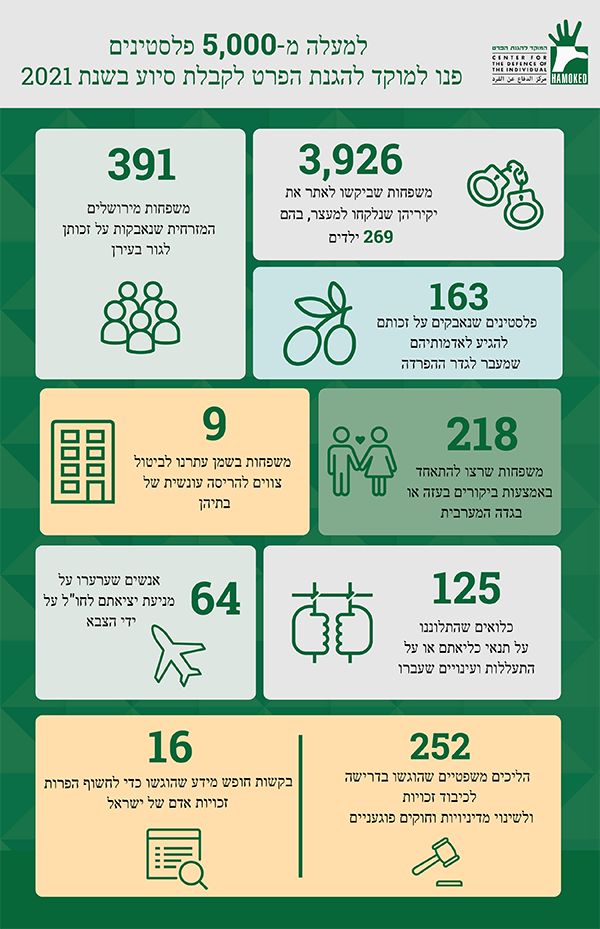 חברות וחברים יקרים, בשנה החולפת, למעלה מ-5,000 פלסטינים פנו למוקד להגנת הפרט לקבלת סיוע. רבים מהם ביקשו שנאתר את יקיריהם שנעצרו; אחרים רצו להגיש באמצעותנו תלונה על אלימות משטרתית שחוו, או עזרה בהשגת אחד מההיתרים הצבאיים הרבים הנדרשים מהם במהלך חיי היום-יום: לגישה לאדמותיהם שמעבר לגדר ההפרדה, לביקור בן משפחה ברצועת עזה, או פשוט כדי שיוּתר להם לגור בבתיהם לצד בן הזוג והילדים בירושלים. קרוב ל-80% ממקרים אלה הסתיימו בהצלחה. שיעור ההצלחה הגבוה מעיד שהמוקד מהווה כתובת אפקטיבית לאנשים שאין להם לאן עוד לפנות, אבל יותר מכל, הוא מוכיח עד כמה ישראל נוהגת בשרירותיות וקלות יד בשליטתה בפלסטינים. לצד הסיוע הפרטני, אנחנו ממשיכים להיאבק באמצעות הגשת עתירות עקרוניות לביטול מדיניות וחקיקה פסולות המפירות זכויות אדם. קשה יותר להגיע להישגים במישור המשפטי העקרוני מלהעניק סיוע ליחידים, ובכל זאת גם בהיבט זה אנחנו נוחלים לא פעם הצלחה. כך למשל, החל מיוני 2021, פלסטינים מעל גיל 50 כבר לא נדרשים לקבל היתר צבאי כדי להגיע אל אדמותיהם שמעבר לגדר ההפרדה. אנחנו לא משלים את עצמנו לגבי האתגרים שניצבים בפנינו. הדיכוי והאלימות הגוברים בכיבוש המתמשך יכולים להביא לידי ייאוש. אבל אנחנו נחושים לעשות כל שביכולתנו כדי להגן על זכויות היסוד של האוכלוסיה הפלסטינית. המוקד לא ניצב לבדו במאבק הזה. אנחנו גאים להיות חלק מקהילת זכויות האדם הנרחבת שכוללת ארגונים, פעילים ותומכים מהזירה המקומית והבינלאומית. תודה לכם על תמיכתכם במוקד. בברכה,