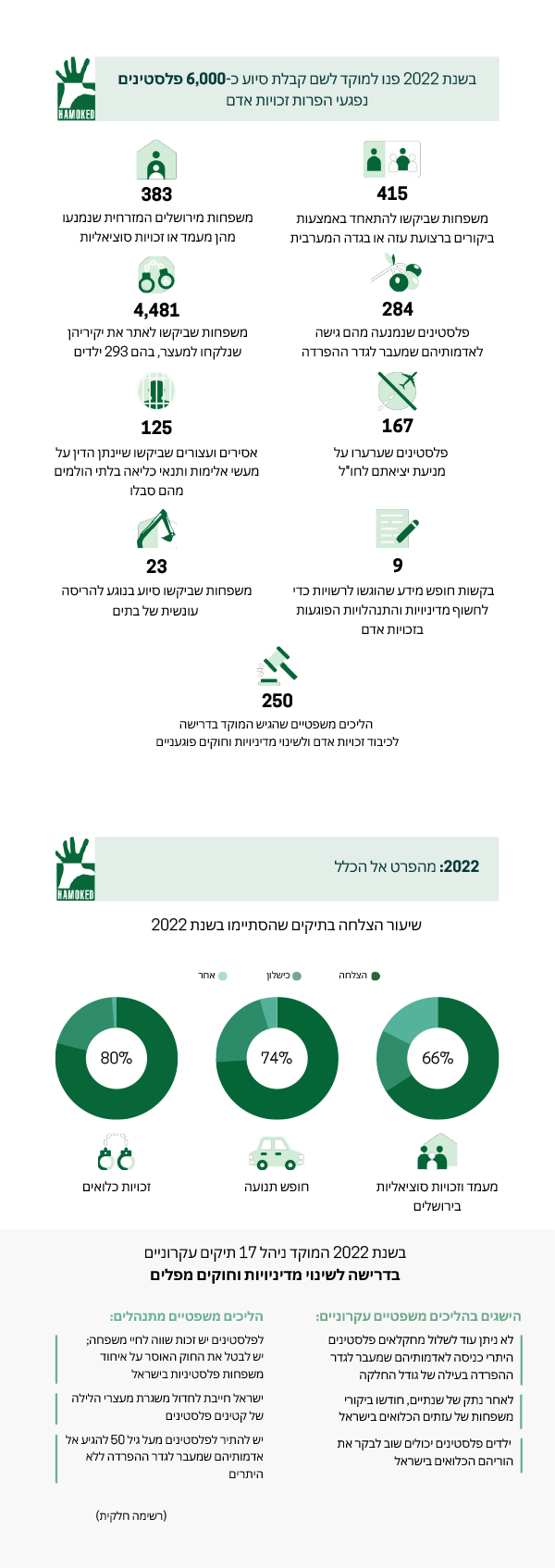 עבודה יומיומית של הגנה על זכויות אדם היא מתסכלת לא פעם ולעיתים אפילו שוברת לב, כמי שרואים את כל הסבל האנושי שמתחולל סביבנו. בשעת כתיבת מילים אלה, מעשי אלימות וענישה קולקטיבית לסוגיה הולכים וגוברים וכולנו מודאגים ממה שיקרה בשבועות הקרובים. לכן, זהו זמן טוב לסקור את עשייתנו בשנה החולפת, כדי להתעודד ולצבור כוחות מהישגינו בתחומים השונים. בשנת 2022, כ-6,000 אנשים פנו למוקד לקבלת סיוע, ולרובם עזרנו בהצלחה: איתרנו קרובי משפחה שנלקחו למעצר; סייענו לחקלאים להמשיך בעיבוד אדמתם; הצלחנו לאחד משפחות מפוצלות; והבאנו לכך שאנשים יכלו לנסוע בחופשיות לחו"ל ולגור בבתיהם ללא חשש מגירוש. להלן ניתן לראות את פילוח המקרים בהם טיפלנו ב-2022.